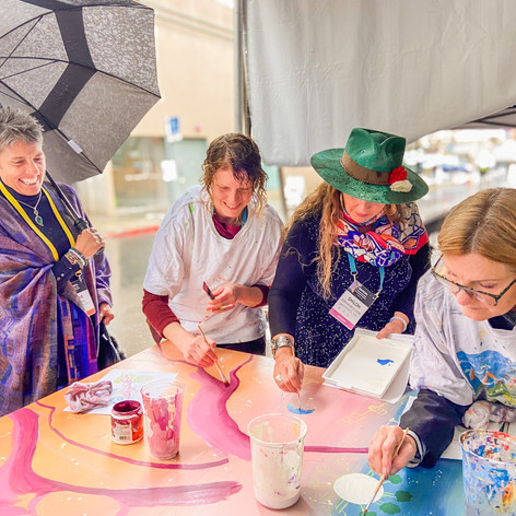 1. The act of making a decision and taking action in creating a work of art, no matter how small, uses the prefrontal and neo-cortex, the thinking brain. The artistic activity takes people out of using the basal ganglia/brain stem region, where territoriality and survival worry take place. Pain relieving endorphins, connecting serotonin and positive feeling oxytocin is released when creating art. Thus, people are in a different head and heart space than when there is only talking.